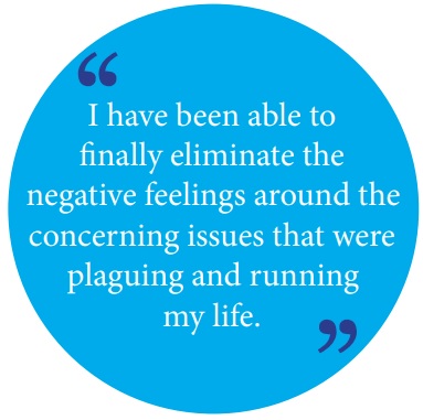 I have been able to finally eliminate the negative feelings around the concerning issues that were plaguing and running my life. I have continued forward feeling better about myself and creating happier relationships. I now have the knowledge, that I am not my negative thoughts and feelings and I do not have to live with them.